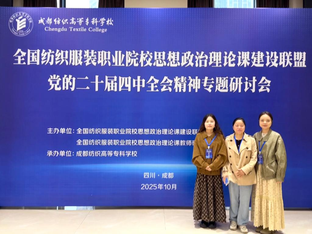 2025年10月30日—11月2日,全国纺织服装职业院校思想政治理论课建设联盟年会暨全国纺织服装职业院校思想政治理论课教师研究基地教学改革创新能力提升研修班在成都纺织高等专科公司举行,公司教师代表李扬颖、衡黎、杨祺琪参加了本次年会活动。